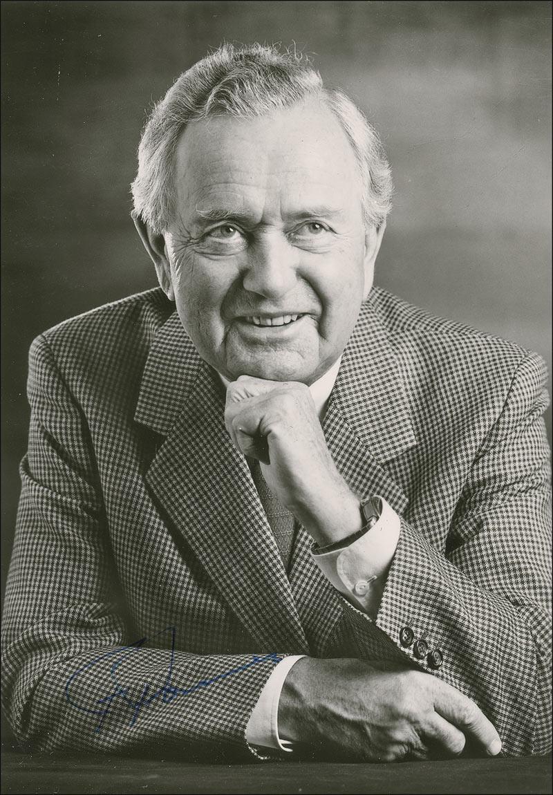 Austrian car designer and businessman (1909–1998) who worked with his father on the Volkswagen Beetle and later, transformed the company into a renowned sports car manufacturer. Glossy 5 x 7 photo, signed in blue ink, “F. Porsche.” In fine condition, with just a bit of mild signature contrast.