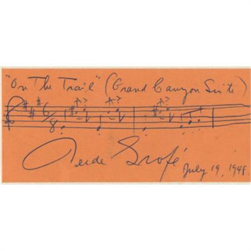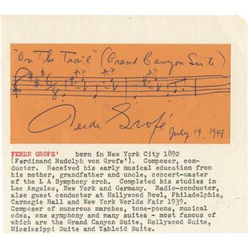 <B>Conductor and Composer Ferdinand Rudolph von Grose Autograph,</B></I> "<I>Ferde Grose</B></I>", on 5.5" x 2.5" sheet, dated July 19, 1948 and containing two manuscript bars of music from his <I>Grand Canyon Suite.</B></I> Mounted to larger collector's card with a brief biography. Very fine condition. Best known as a radio conductor, Grose also directed orchestras at Carnegie Hall and the New York World's Fair of 1939.<BR><BR><b>Shipping:</b> Flat Material, Small (<a target="_blank" href="http://www.heritageauctions.com/common/shipping.php">view shipping information</a>)