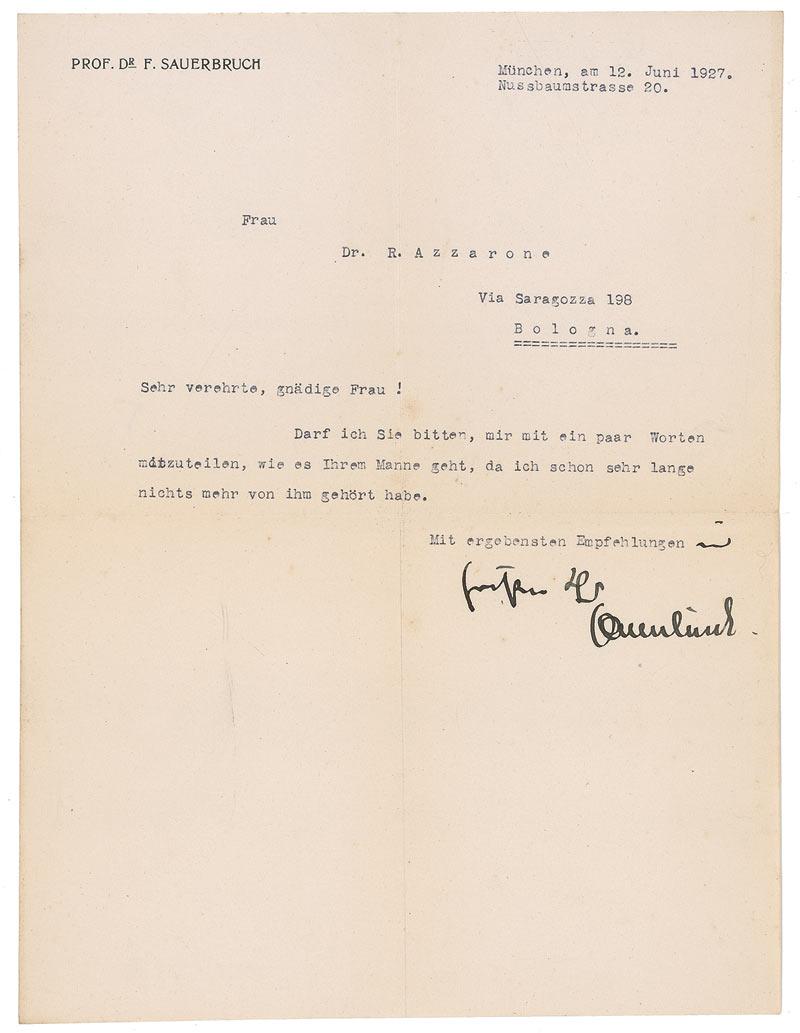 German surgeon (1875–1951). TLS in German, signed “Sauerbruch,” one page, 8.25 x 11, personal letterhead, June 12, 1927. Letter to Mrs. Dr. R. Azzarone in Bologna about her husband, a former patient of Sauerbruch. In part (translated): “May you tell me how your husband is doing as I haven't heared from him for a long time.” In fine condition, with central horizontal and vertical fold and a mild shade of toning. RRAuction COA.