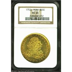 Ferdinand VI Gold 8 Escudos 1752J, KM50, FR16, MS63 NGC, a second and even finer representative of t