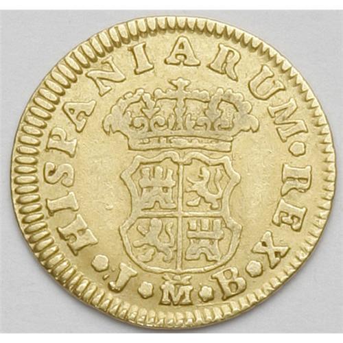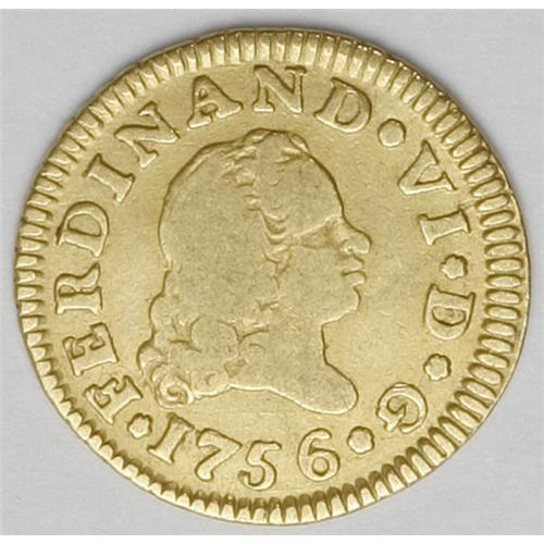 <B>Ferdinand VI gold 1/2 Escudo 1756M-JB, </B></I>KM378, nice AVF, evenly worn.