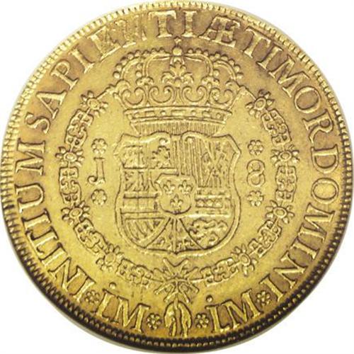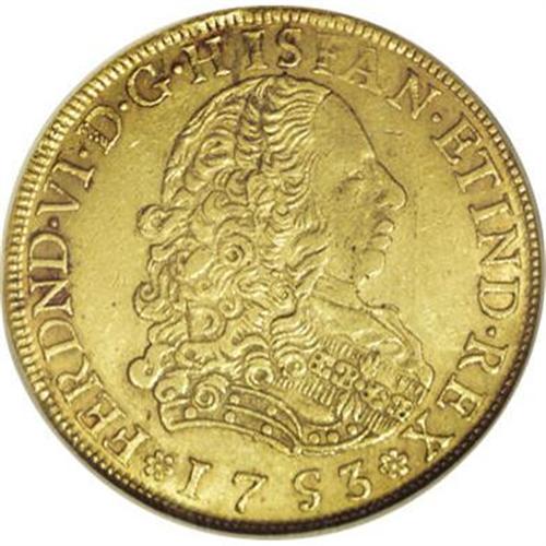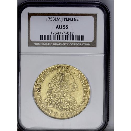 <B>Ferdinand VI gold 8 Escudos 1753-J, </B></I>KM50, AU55 NGC, lightly toned with traces of mint luster in the legends, sharply defined details, minor flan flaws on the King's cheek. An attractive example of this early type with the large bust of Ferdinand.<BR><BR><b>Shipping:</b> Coin/Currency (<a target="_blank" href="http://www.heritageauctions.com/common/shipping.php">view shipping information</a>)