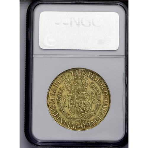 Ferdinand VI gold 8 Escudos 1753-J, KM50, AU55 NGC, lig