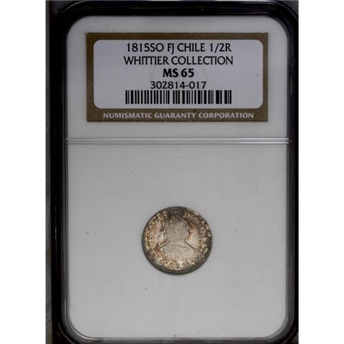 <B>Ferdinand VII 1/2 Real 1815FJ-So, </B></I>KM64, MS65 NGC, a sparkling example with highly appealing brown and gold toning over full mint brilliance. Just a delightful little coin which would be virtually impossible to improve upon.