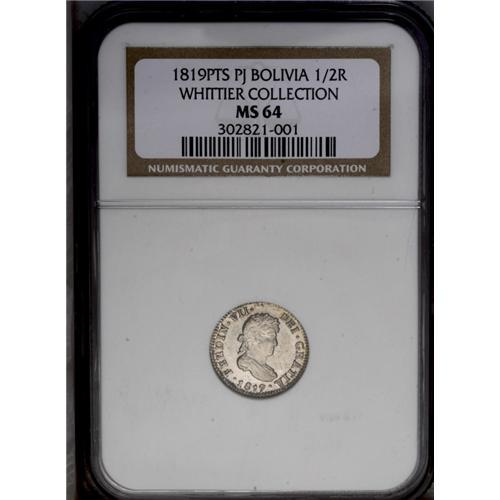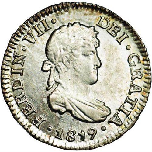 <B>Ferdinand VII 1/2 Real 1819-PJ, </B></I>KM90, MS64 NGC, superbly struck and toned, a most attractive example.