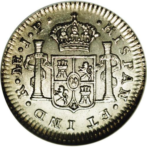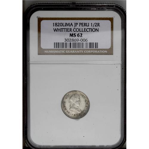 <B>Ferdinand VII 1/2 Real 1820-JP, </B></I>KM113.2, MS62 NGC, well-struck and lustrous with medium gray patina in the obverse legends.