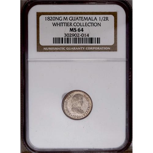 <B>Ferdinand VII 1/2 Real 1820NG-M, </B></I>KM65, MS64 NGC, a superbly toned example with full underlying brilliance and very sharp details. The reverse is prooflike. Very desirable quality!