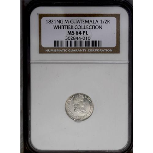 Ferdinand VII 1/2 Real 1821NG-M, KM65, MS64 NGC Proofli Ferdinand VII 1/2 Real 1821NG-M,