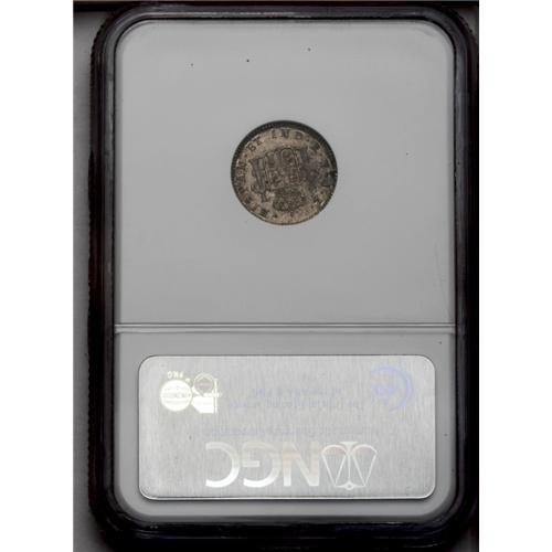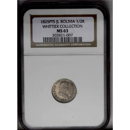 <B>Ferdinand VII 1/2 Real 1825-JL, </B></I>KM90, MS63 NGC, strong details and lovely old-time pewter gray patina. Final date of the Spanish colonial series for Potosi.