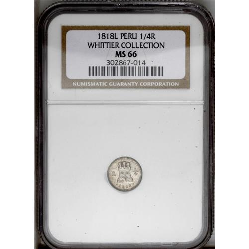 <B>Ferdinand VII 1/4 Real 1818-L, </B></I>KM108, MS66 NGC, lightly toned with full mint luster, a superb example with great eye appeal.