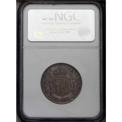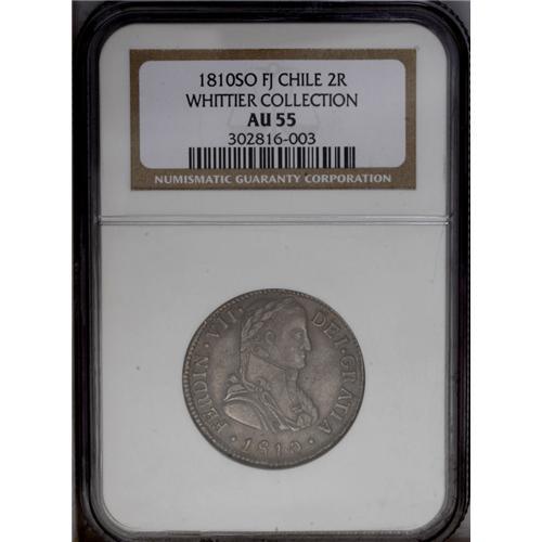 <B>Ferdinand VII 2 Reales 1810FJ-So, </B></I>KM74, AU55 NGC, V in VII is an inverted A, military laureate bust, a well-detailed example with moderate gray patina throughout. Very scarce type and grade.