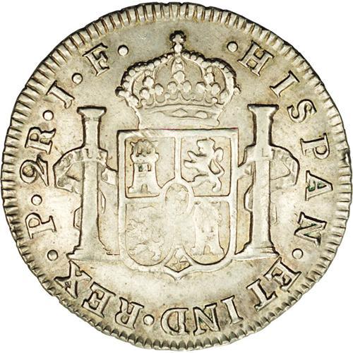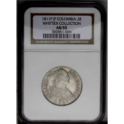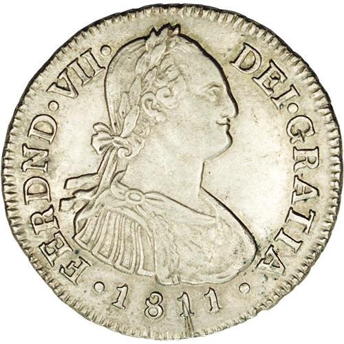 <B>Ferdinand VII 2 Reales 1811P-JF, </B></I>KM70.2, AU55 NGC, very sharp details with some traces of luster in the legends. Small scratches on the second 1 of the date, barely noticeable.