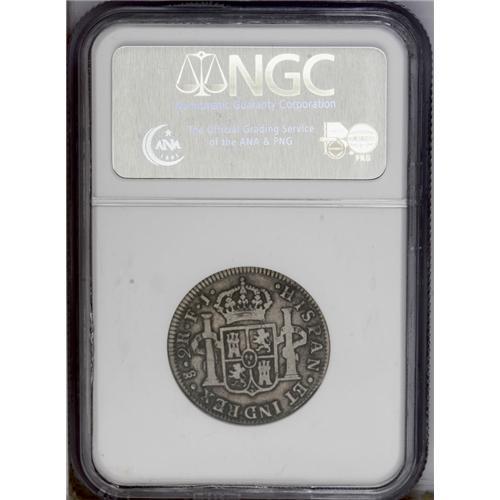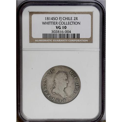 <B>Ferdinand VII 2 Reales 1814FJ-So, </B></I>KM79, VG10 NGC, an attractive circulated example of this very rare date with all details very clear. Only four pieces of this date have been recorded and this is the nicest!