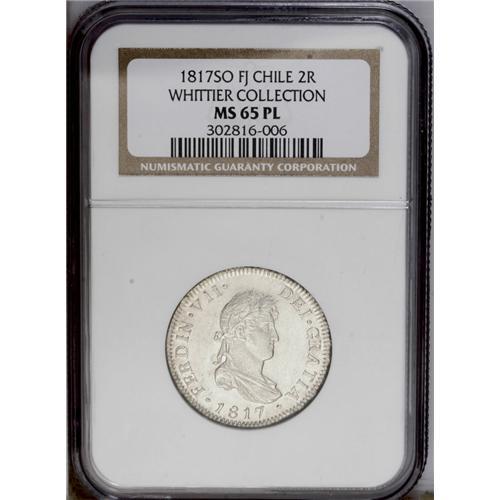 <B>Ferdinand VII 2 Reales 1817FJ-So, </B></I>KM79, MS65 NGC Prooflike, an incredible example with full luster and mirrored reflective fields and a meticulously sharp strike. Certainly at or near the top for condition census!