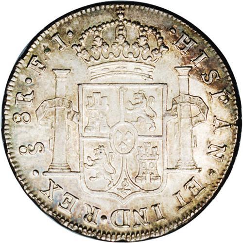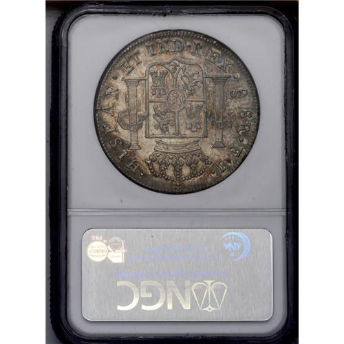 <B>Ferdinand VII 8 Reales 1814FJ-So, </B></I>KM80, MS62 NGC, a choice coin with that perfect blend of light gold and gray toning and underlying luster. The strike is very sharp and there are no distracting adjustment marks or flan flaws. If you like that old-time numismatic cabinet look, this is the coin for you.
