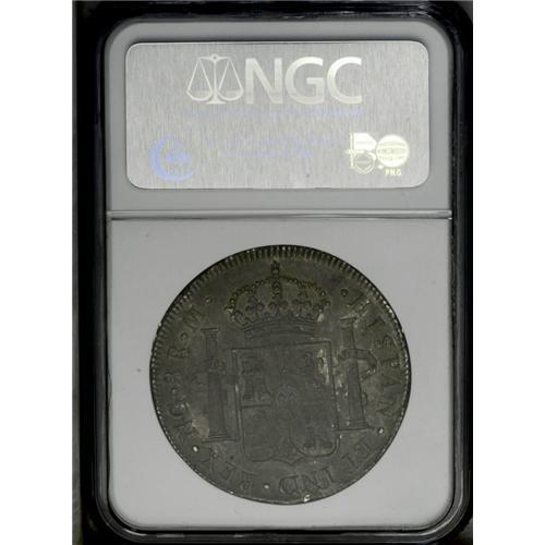 <B>Ferdinand VII 8 Reales 1815NG-M, </B></I>KM69, MS61 NGC, deep gray-gold patina with a few tiny surface marks. Proper bust of Ferdinand.