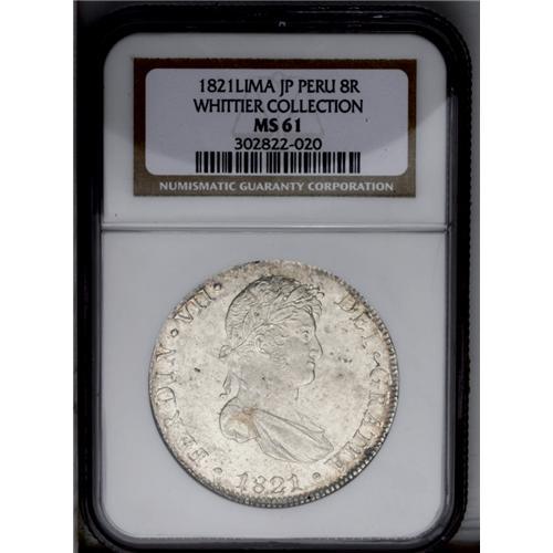 <B>Ferdinand VII 8 Reales 1821-JP, </B></I>KM117.1, MS61 NGC, well-struck design details and virtually complete mint brilliance, some tiny contact marks on the obverse (bust side.)