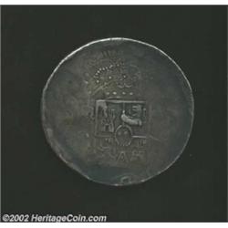Ferdinand VII 8 Reales Durango, KM110.1, Crude VF but with no real wear evident. Struck from 1811-1814 during the turbulent War of Independence, this coin lacks the date and mint, but the portrait of the king and the arms on the reverse are quite bold. Only the DE of DEI is legible on the obverse, while a D (either of DE or Durango) is clear in the reverse legend. Very rare in any grade, this fascinating coin reflects the times in its crude manufacture. Important notice: We expect to be auctioning lots at the rate of 200-250 per hour. Sometimes eBay Premier live bid software cannot keep up with that pace, so we strongly recommend that you place a realistic proxy bid now as insurance to avoid disappointment. Also please note that all Heritage/CAA lots purchased through eBay Premier carry a 20% Buyer's Premium. Please make sure you read the Terms and Conditions.