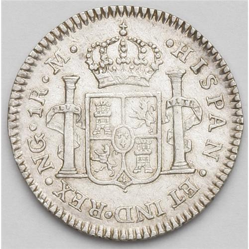 <B>Ferdinand VII Real 1810NG-M, </B></I>KM61, lustrous XF, tiny dig above the King's forehead, bust of Carlos IIII. Scarce type and grade.