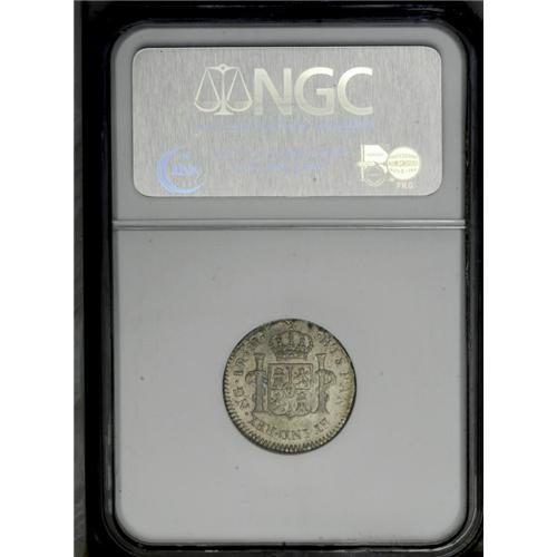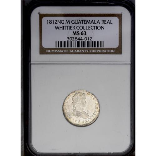 <B>Ferdinand VII Real 1812NG-M, </B></I>KM66, MS63 NGC, proper bust, very nicely struck example with full mint luster and just a few vague obverse adjustment marks. Rare and desirable quality for this date.