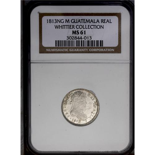 <B>Ferdinand VII Real 1813NG-M, </B></I>KM66, MS61 NGC, lightly toned and attractive with full original mint bloom, some very tiny flan flaws apparently affected the grading on this piece.