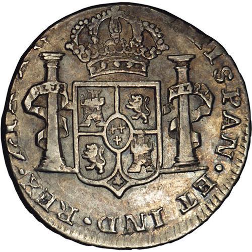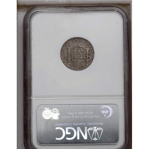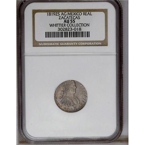 <B>Ferdinand VII Real 1819Zs-AG, </B></I>KM82.1, AU55 NGC, remarkably bold details and original light gray toning. Very scarce and attractive grade for this type struck during the War of Independence. Ex-Ray Johnson Collection.