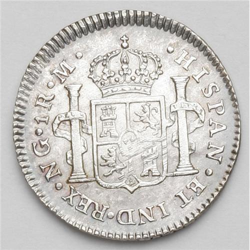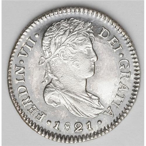 <B>Ferdinand VII Real 1821NG-M, </B></I>KM66, nice AU-UNC, unusually sharp details, very lightly cleaned long ago.