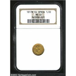 Ferdinand VII gold 1/2 escudo 1817 M-GJ, Bust right with date below/Crowned arms, F-318, KM-141, MS61 NGC. Important notice: We expect to be auctioning lots at the rate of 200-250 per hour. Sometimes eBay Premier live bid software cannot keep up with that pace, so we strongly recommend that you place a realistic proxy bid now as insurance to avoid disappointment. Also please note that all Heritage/CAA lots purchased through eBay Premier carry a 20% Buyer's Premium. Please make sure you read the Terms and Conditions.