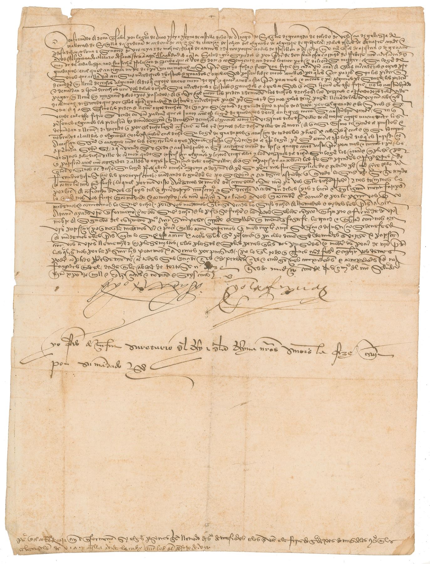 Untranslated manuscript DS in Spanish, signed “Yo el Rey," [I the King] and "Yo el Reyna," [I the Queen], one page, 12 x 16, 1496. Reverse retains the original embossed paper seal. In fine condition, with a few short edge tears. A highly desirable piece from the Catholic monarchs known for their institution of the Inquisition and their sponsorship of Christopher Columbus.