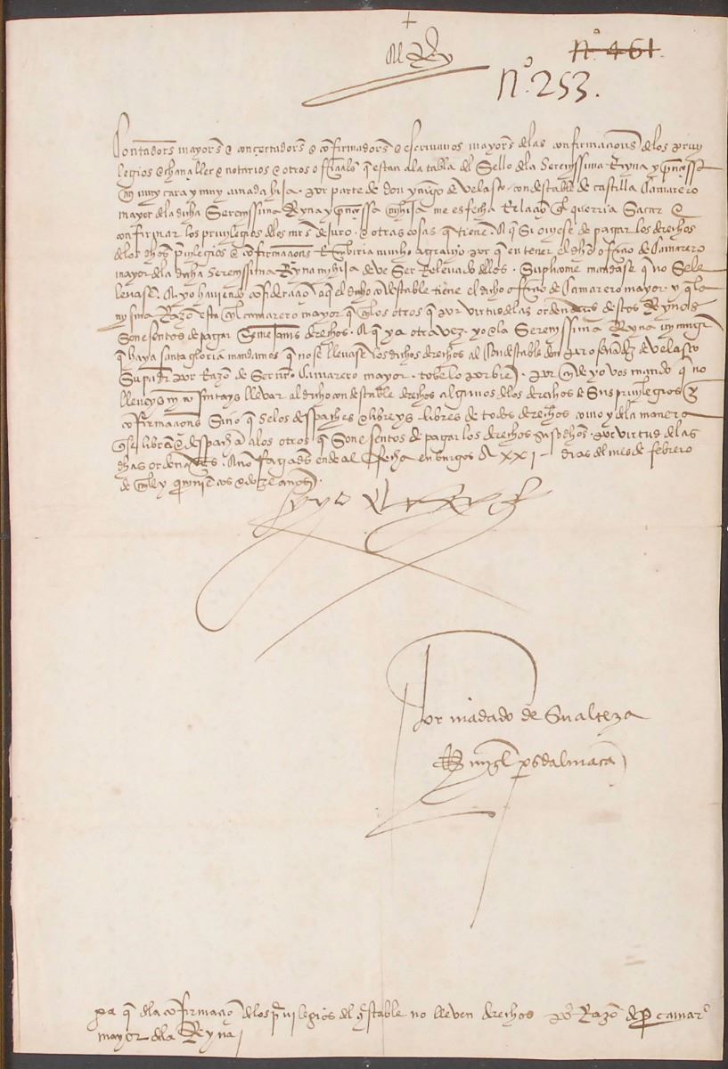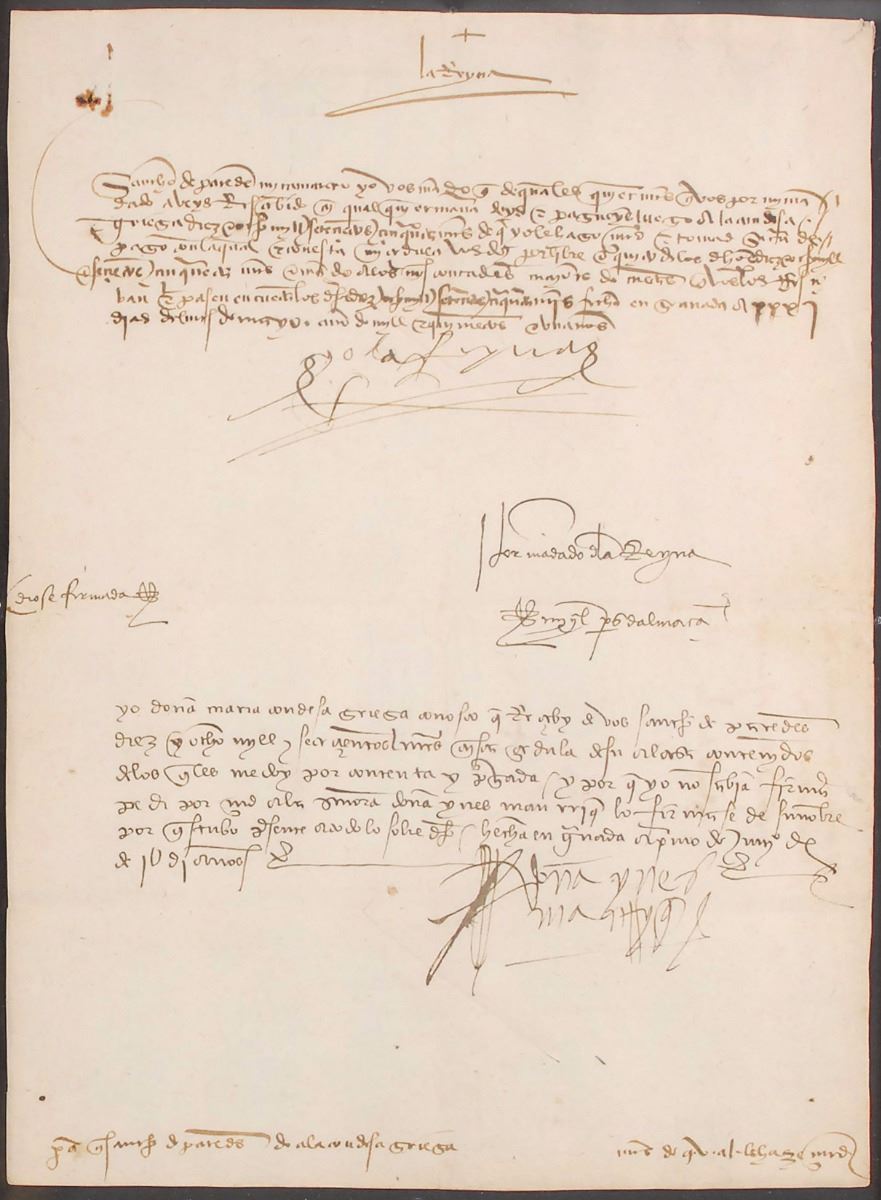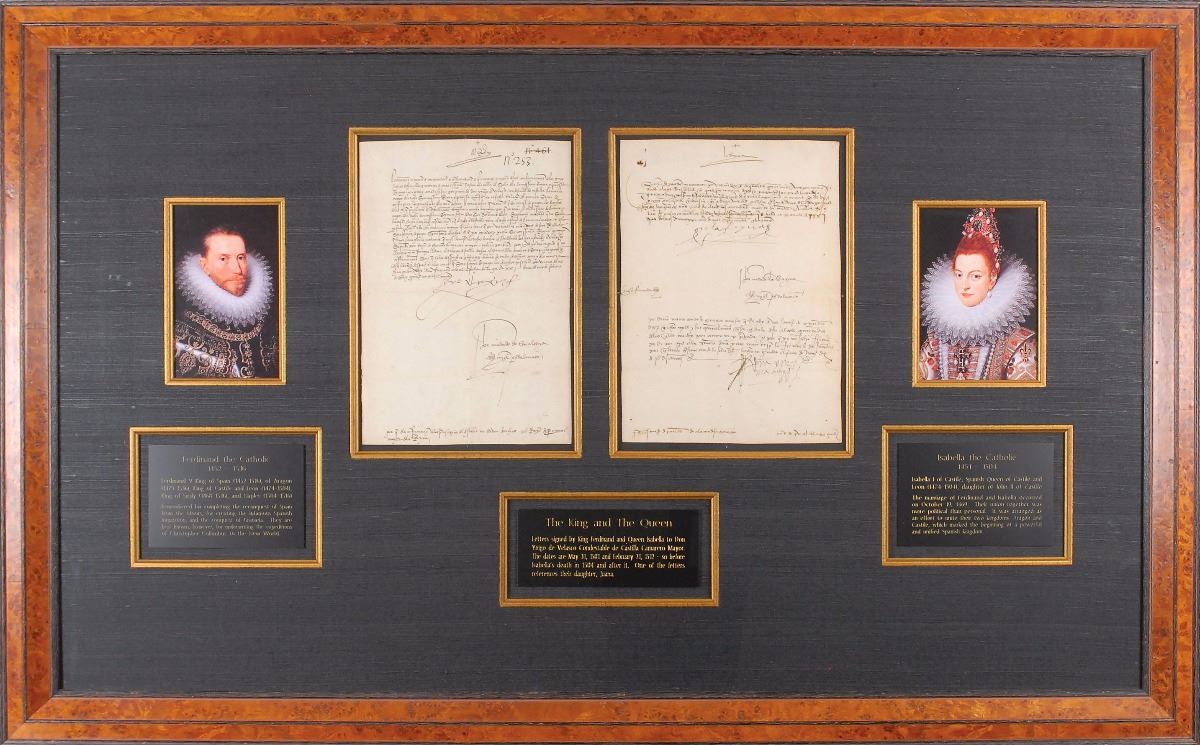 Pair of boldly penned letters in old Spanish. First, an LS signed by King Ferdinand at the center, "Yo el Rey,” [I the King] one page 8 x 11.5, dated February 21, 1512. Letter to the senior accountants of his daughter, Queen Joanna of Castile, in full (translated): “Senior accountants and reconcilers and confirmers and senior scribes of confirmations of privileges and chancellor and notaries and other officials who are in the office of the seal of the most serene queen and princess, my very dear and very beloved daughter: I have been informed by Don Yñigo de Velasco, constable of Castile, senior chamberlain of the said most serene queen and princess, my daughter, that he wished to have copied and confirmed the privileges of maravedíes in the form of bonds and other things that he has, and that if he had to pay the fees for the said privileges and confirmations, he would receive great injury, because due to the fact that he holds the said office of senior chamberlain of the said most serene queen, my daughter, he ought to be relieved of them. He petitioned me to order that he not be charged them, and taking into consideration the fact that the said constable holds the said office of senior chamberlain, and that the senior chamberlain has the same grounds to be exempt from paying fees of this sort as the others who are exempt in virtue of the ordinances of these kingdoms, and that already on a previous occasion I and the most serene queen, my wife (may she rise in glory), ordered that his father, the constable Don Pero Fernandez de Velasco, not be charged the said fees, on the grounds that he was our senior chamberlain, I thought it right. Therefore I order you not to charge the said constable or consent that he be charged any fees from the fees for his privileges and confirmations, but rather that you dispatch and issue them to him free of all fees, as and in the manner that they are issued and dispatched to the others who are exempt from paying the aforesaid fees in virtue of the said ordinances, and that you not do otherwise. Done in Burgos on the 21st day of the month of February of the year one thousand five hundred twelve.” Unable to cope with the tragic death of her husband Philip six years prior, ‘Joanna the Mad’ was deemed mentally ill and confined to a nunnery, with a large staff responsible for her day-to-day business.