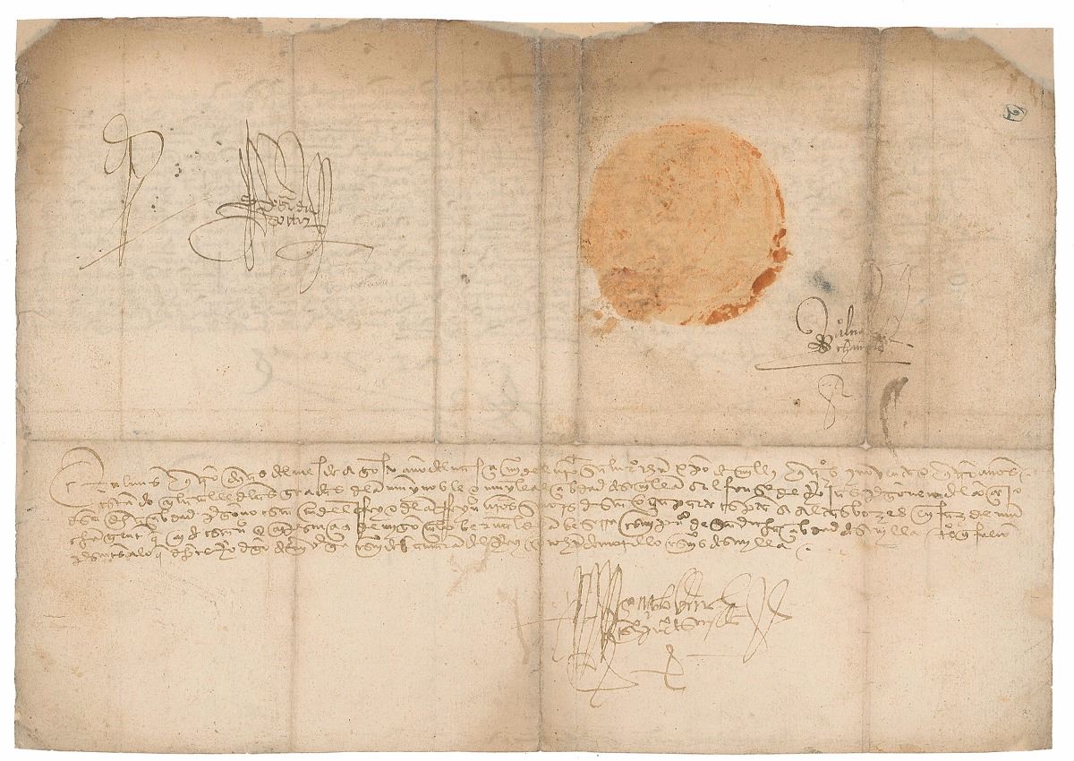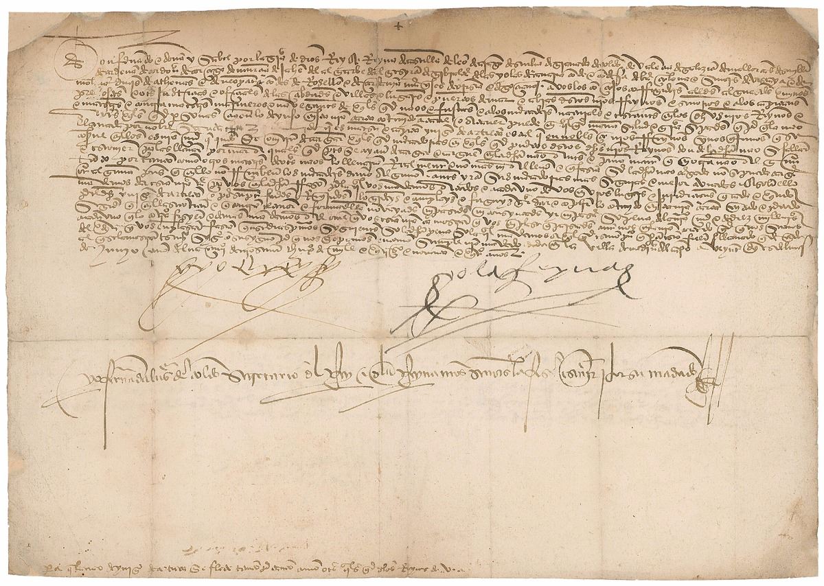 Spanish monarchs best known as the sponsors and patrons of Christopher Columbus. Manuscript DS in Spanish, signed “Yo el Rey,” [I the King] and “Yo el Reyna,” [I the Queen], one page, 12.25 x 8.5, June 10, 1494. Untranslated document signed three days after Spain and Portugal agreed upon the Treaty of Tordesillas, referring to the new laws of navigation imposed by the treaty. In very good condition, with intersecting folds, toning to the top, and professionally repaired paper loss to upper edge.