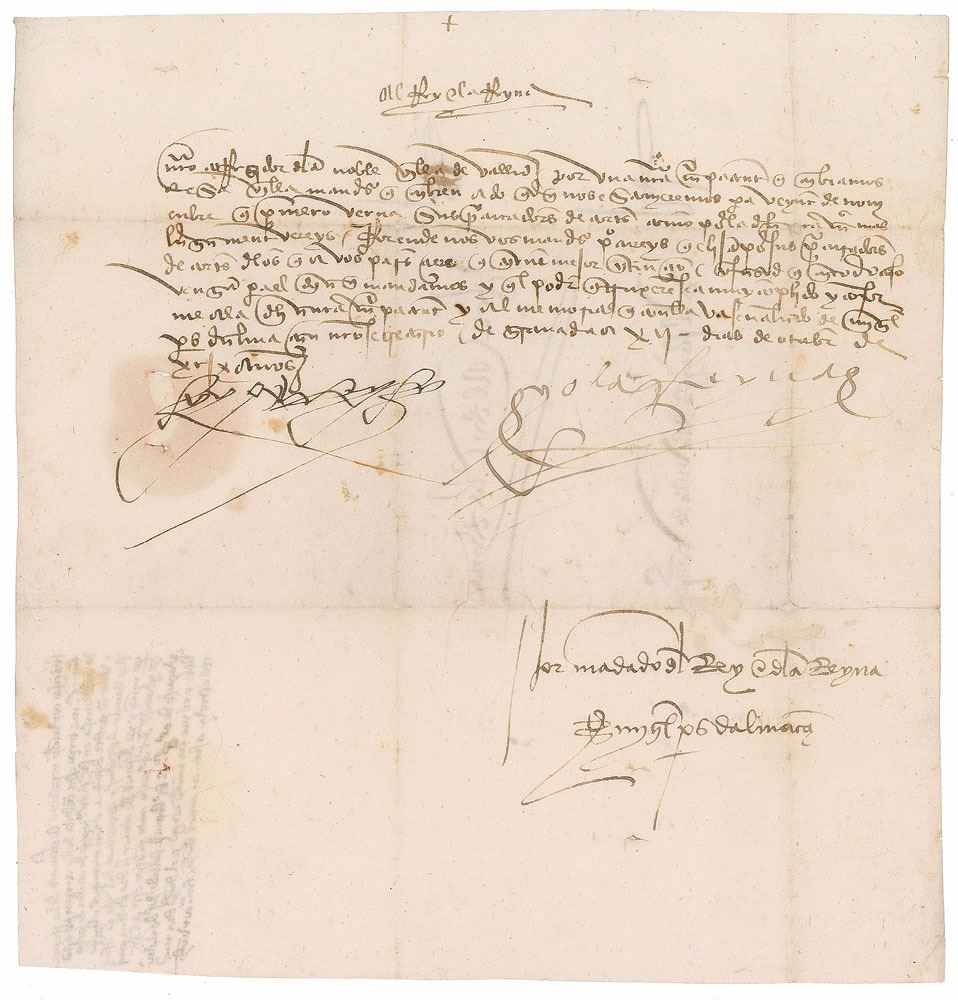 Exceptional LS in Spanish, signed “Yo el Rey," [I the King] and "Yo el Reyna," [I the Queen], one page, 8.5 x 9, October 12, 1499. In full (translated): "Our municipal royal representative in the noble town of Valladolid. By a patent letter or ours that we are sending to that town, we are ordering that they send their parliamentary representatives to wherever we may be on the twentieth of November next coming, as you will see at greater length in our said letter. We therefore order that you endeavor to see to it that they choose their parliamentary representatives from among those who seem to you to have better intentions, and bring it about that in any case they come on the day we order and that the powers they bring are very complete and in accordance with our said patent letter and the memorandum that accompanies it with the signature of Miguel Peres Dalmacan, our secretary." Signed at the conclusion by the king and the queen, and countersigned by Dalmacan. In fine condition, with a small repair to a seal-related tear at the very start of the king's signature. A decidedly crisp letter signed by both the king and queen of Castile, dating to the seventh anniversary of Columbus’s landing on ‘the new world.’ On October 12, 1492, the flagship Santa Maria, searching for an alternate trade route to Asia, sighted a Bahamian island. Upon landfall, Columbus claimed the region in the name of his benefactors, Isabella and Ferdinand, and called it San Salvador, which means ‘Holy Savior.’ The place name of this letter also holds great interest, as Valladolid, the de facto capital of Castile and Leon, was where Isabella and Ferdinand were married on October 19, 1469, and where Columbus died in 1506.