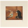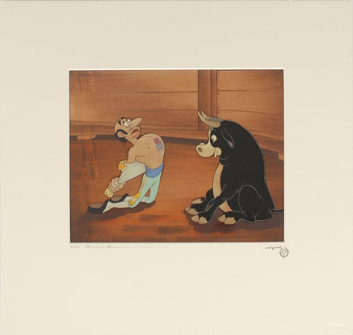(Walt Disney Studios, 1938) Choice original production cels featuring Ferdinand and the Matador from Ferdinand the Bull. The cels have been trimmed to image and applied to a woodgrain background as prepared by Courvoisier Galleries for sale. Images measure 3.25 x 4 and 4.25 x 5, with a mat opening of 9 x 7.25. Mat dimensions are 15 x 14. The piece has the original Disney Courvoisier Galleries label on the reverse. In fine condition. This classic early Disney cartoon won the 1938 Academy Award for Best Short Subject (Cartoons). A fabulous Courvoisier set-up featuring the short’s main characters.