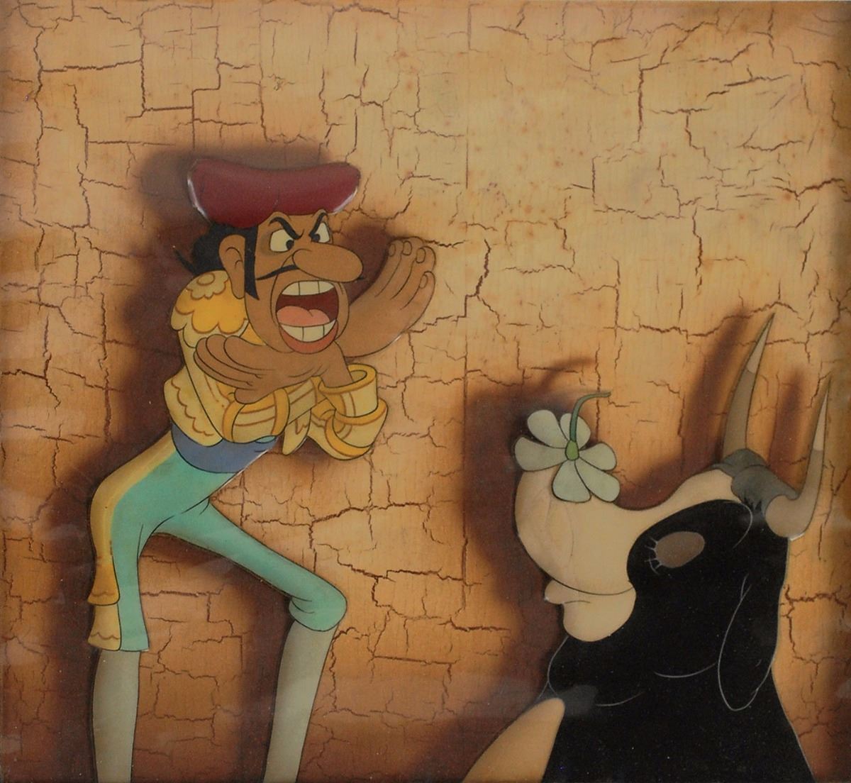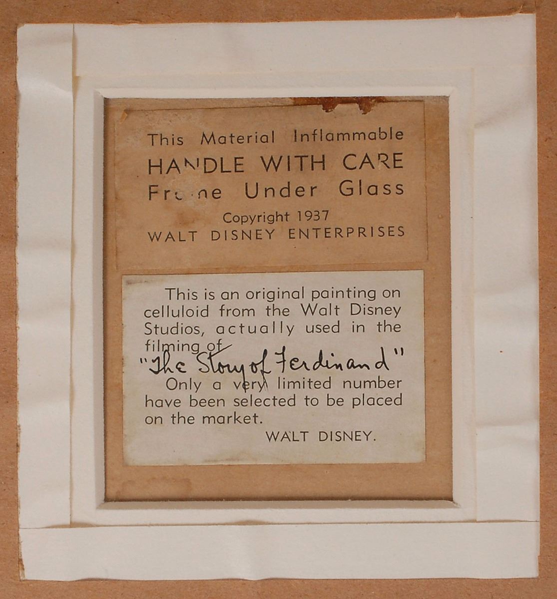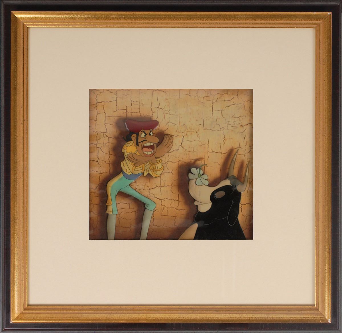 (Walt Disney Studios, 1938) Original production cels featuring Ferdinand and the Matador from Ferdinand the Bull. The cels have been trimmed to image and applied to a hand-painted background as prepared by Courvoisier Galleries for sale. Images measure 3.5 x 6 and 3.5 x 4.5, with a mat opening of 8.5 x 7.5. This piece is also framed to an overall size of 18 x 17.5. The piece has the original Walt Disney Enterprises label on the reverse. In fine condition, with some rippling and cracking to paint. This classic early Disney cartoon won the 1938 Academy Award for Best Short Subject (Cartoons). A fabulous Courvoisier set-up featuring the short’s main characters.