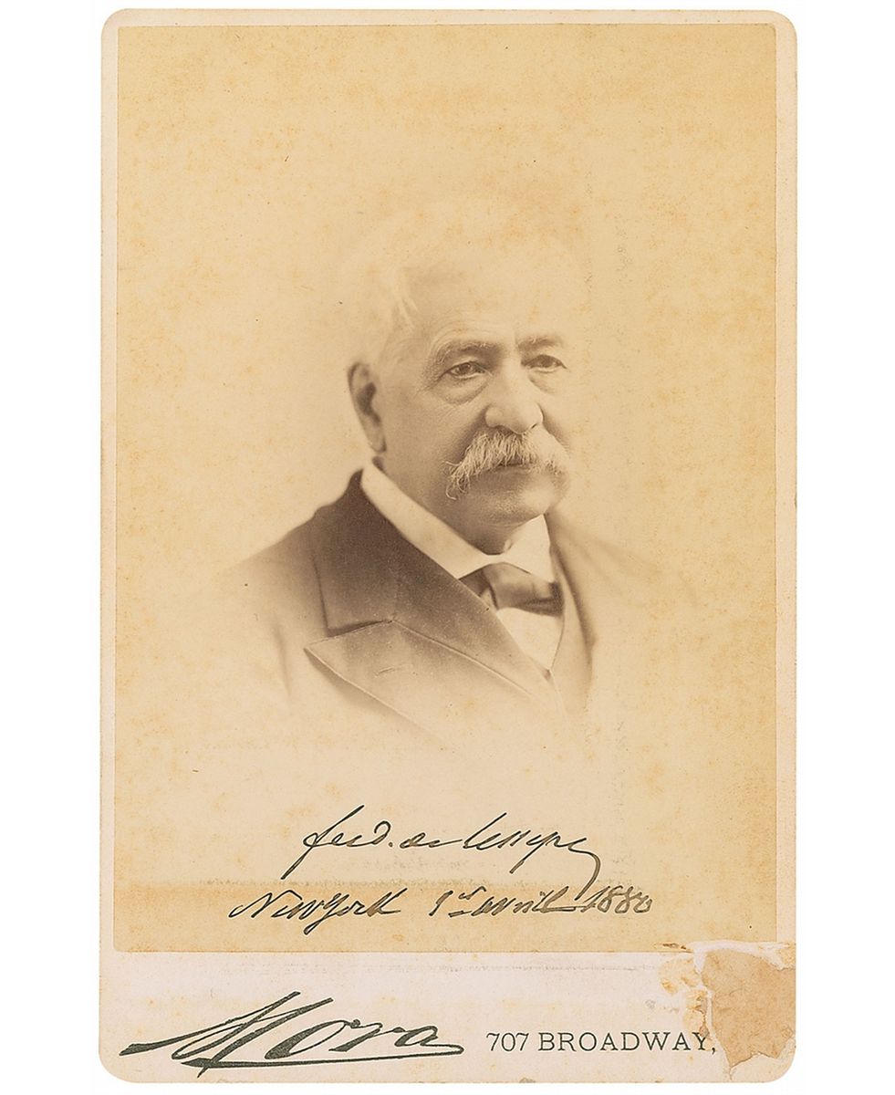 French diplomat (1805–1894) who spearheaded the project to build the Suez Canal. Original 4.25 x 6.5 cabinet photo by Mora of New York, signed at the bottom of the image in black ink, “Ferd. de Lesseps, New York, 1st Avril, 1880.” In very good condition, with moderate scattered foxing and toning to the image, some surface loss to the lower right corner of the mount, and various pencil notations to reverse.
