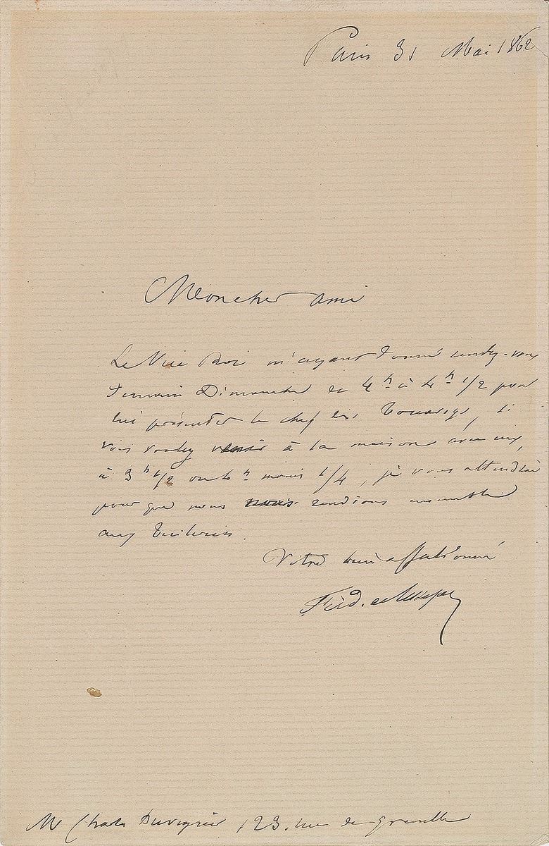 French diplomat (1805–1894) who spearheaded the project to build the Suez Canal. Untranslated ALS in French, signed “Ferd. de Lesseps,” one page, 5.25 x 8, May 31, 1862. In fine condition.