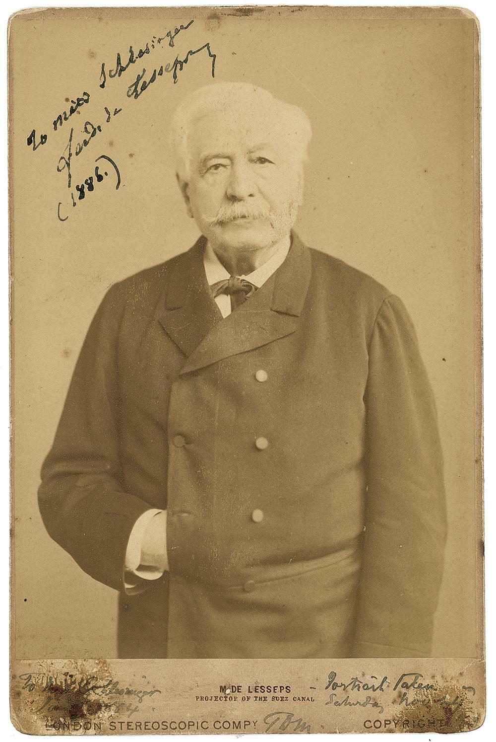 French diplomat (1805–1894) who spearheaded the project to build the Suez Canal. Formal 4.25 x 6.5 cabinet portrait by the London Stereoscopic Company showing Lesseps with his hand in his jacket, signed and inscribed in the upper left, he adds the date of 1886; the lower border bears an additional initialed inscription in another hand, perhaps the photographer, with information on when the photo was taken. In very good condition, with a few small spots of foxing to the image and two old adhesive stains to the lower border affecting the second inscription. Provenance: The Barry Hoffman Collection.