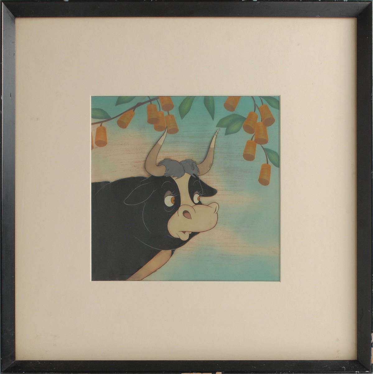 (Walt Disney Studios, 1938) Ideal original production cel from Ferdinand the Bull, portraying the titular bovine below the flowered branches of his favorite tree. The cel has been trimmed and applied to a hand-painted background as prepared by Courvoisier Galleries for sale Image measures 6.75 x 8, with a mat opening of 9.75 x 9.5. This piece is also framed to an overall size of 19 x 19. The piece has the original Disney Courvoisier Galleries label on the reverse. In fine condition. A large and desirable Courvoisier setup from this Oscar-winning short film.