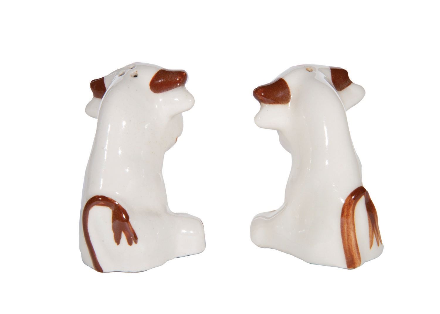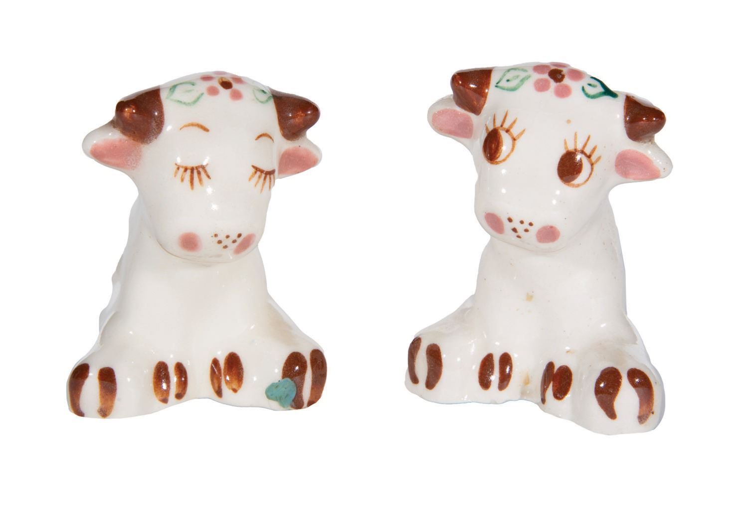 (1930s) A pair of painted glazed ceramic Ferdinand the Bull salt and pepper shakers. Measuring 3" tall, the shakers are in fine condition, with light crazing to the salt shaker, and cork stoppers missing.