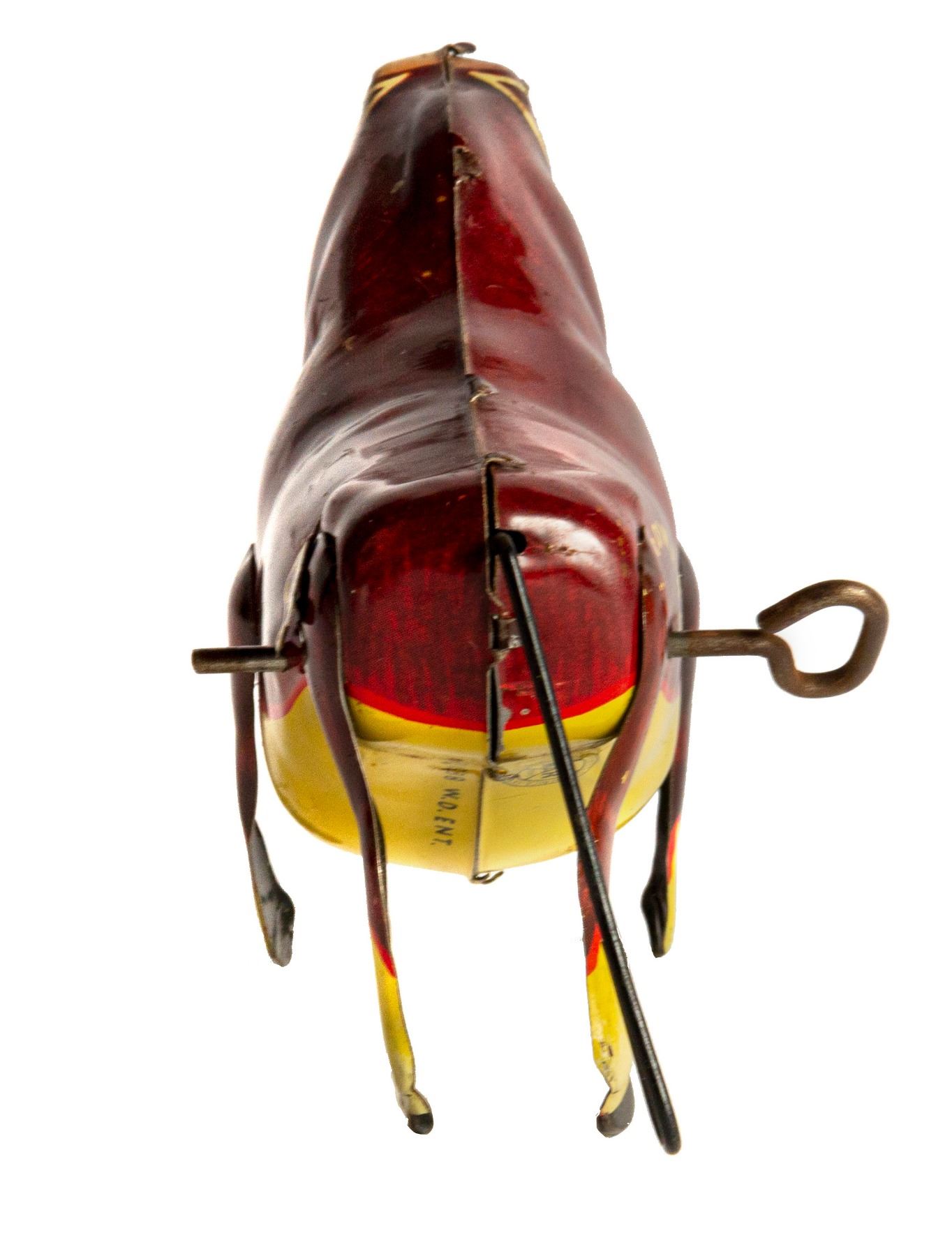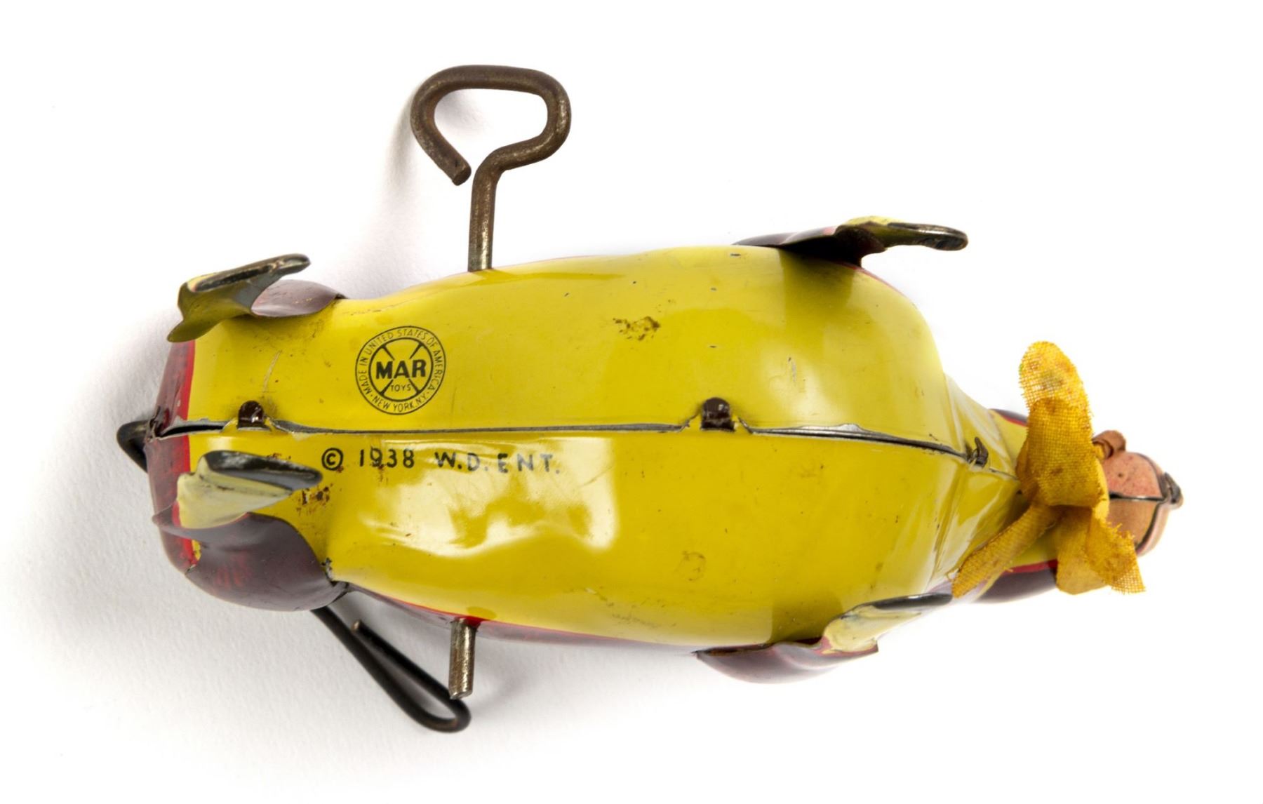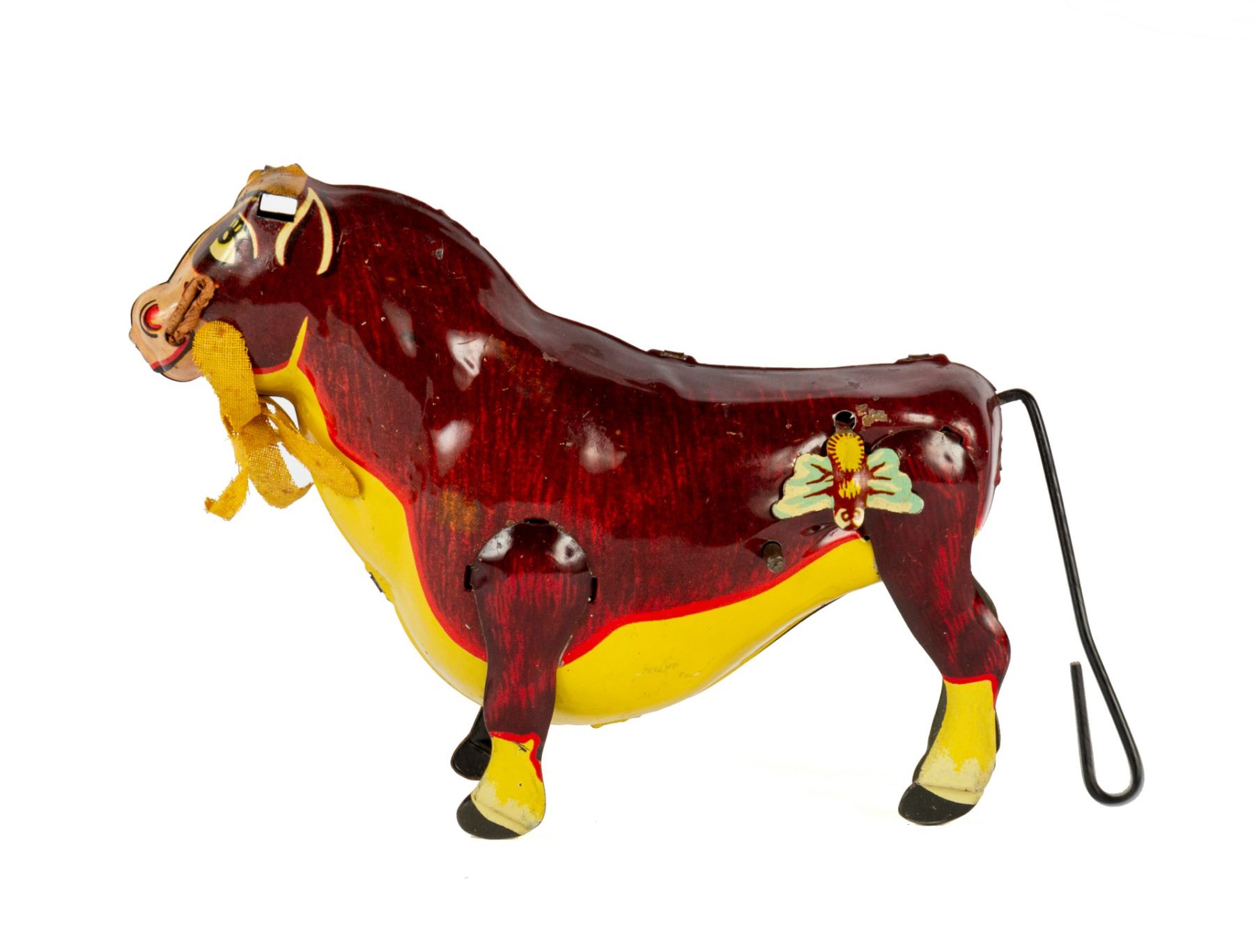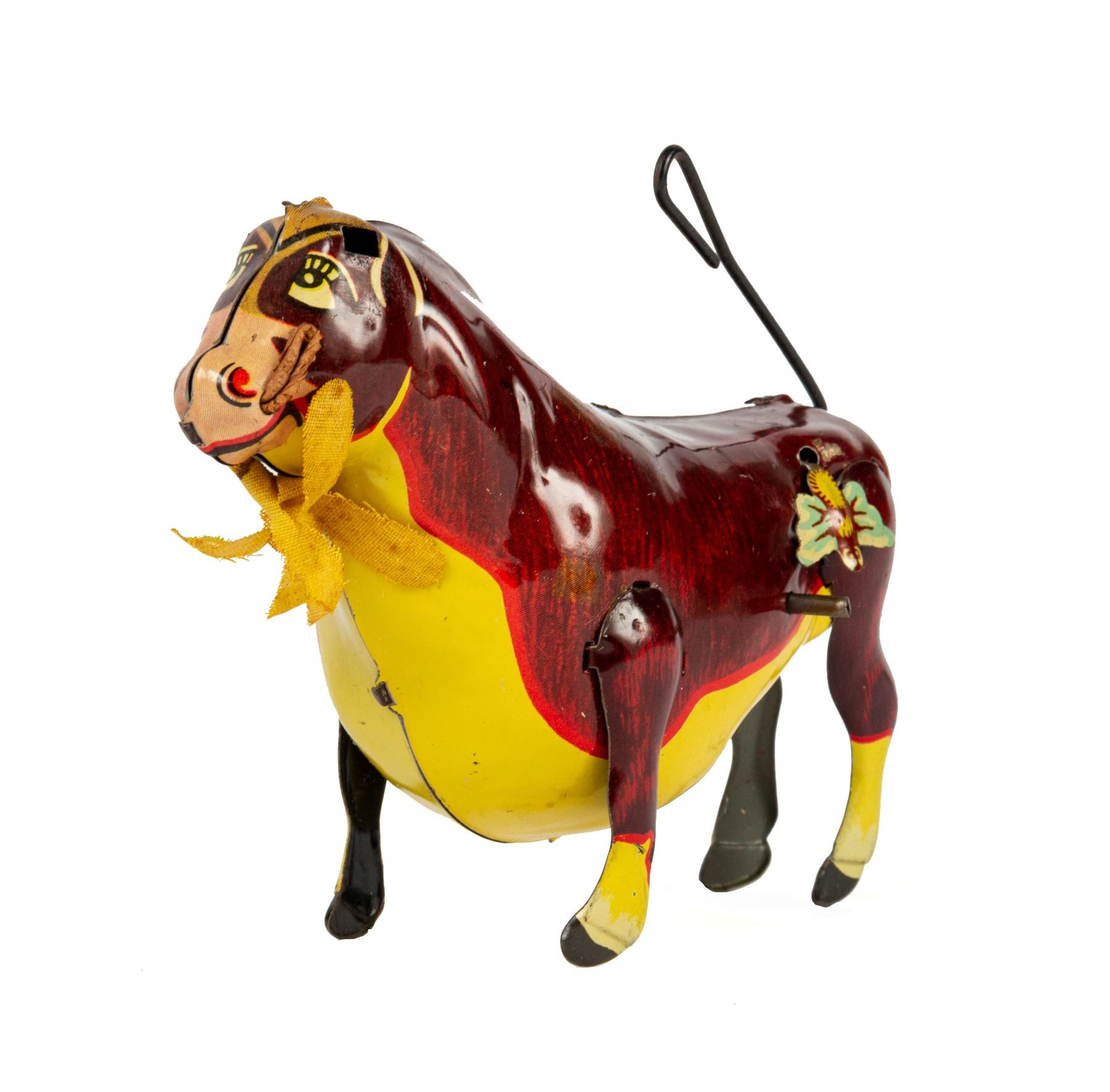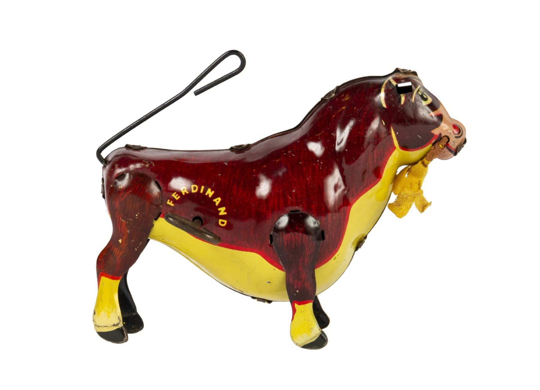 (Marx, 1938) A vintage wind-up tin toy of Ferdinand the Bull created by Marx. The toy still has the original fabric flower held in Ferdinand's mouth, but is missing his rubber horns. Measuring 4.25"x6.25", the toy is in fair to good condition, with some wear due to age. Some of the inner mechanisms may need repair, but the tail still spins.