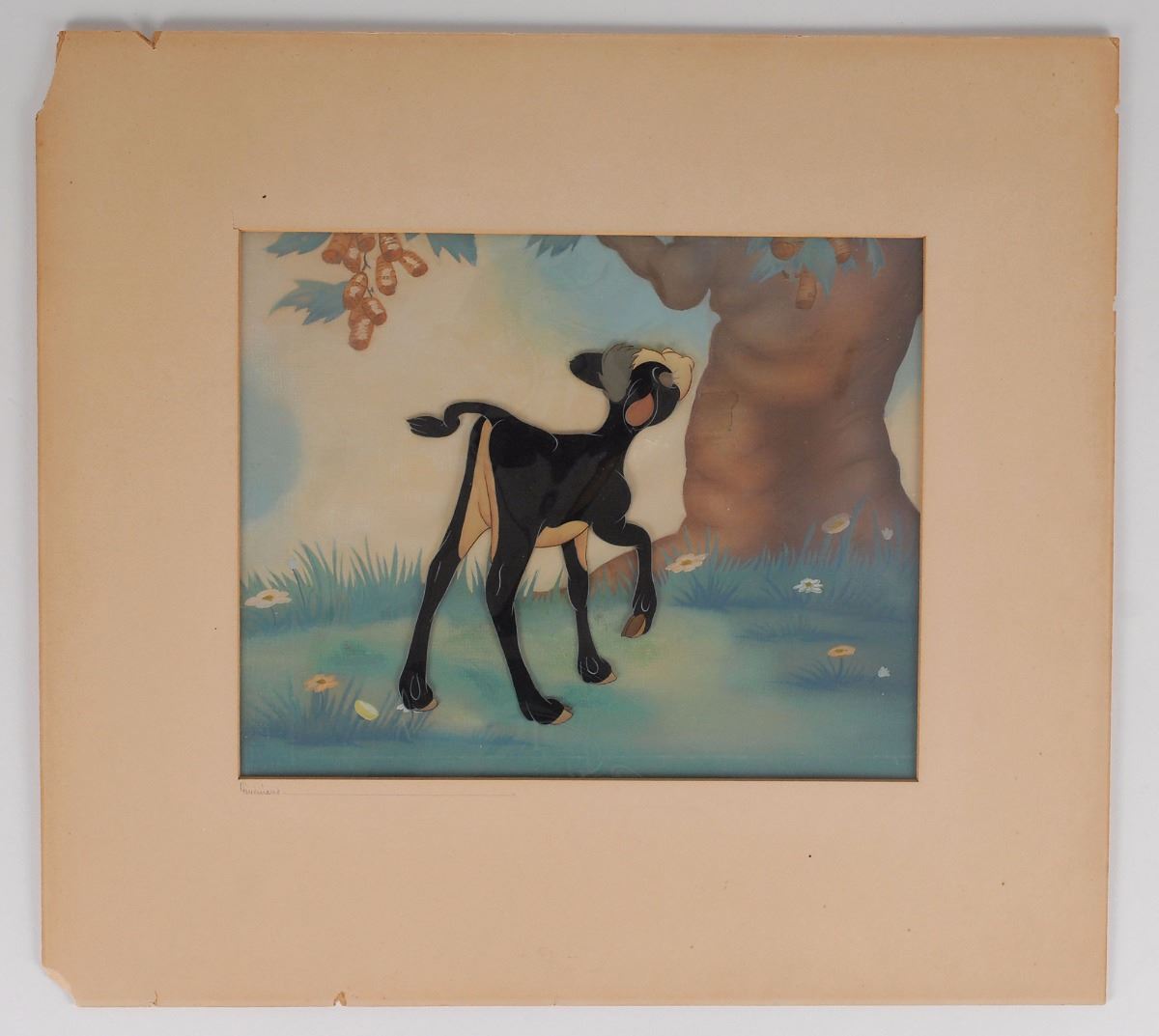 (Walt Disney Studios, 1938) Original production cel featuring Ferdinand the Bull from Ferdinand the Bull, showing the titular character as a proud, young calf. The cel is placed on a hand-painted production background. Image measures 4.5 x 6.25, with a mat opening of 10.75 x 8.75. Mat dimensions are 17.25 x 15.5. Reverse bears a Walt Disney products copyright stamp. A spot of dampstaining to background, surface impressions from previous matting, and scattered dings and toning to mat, otherwise fine condition.
