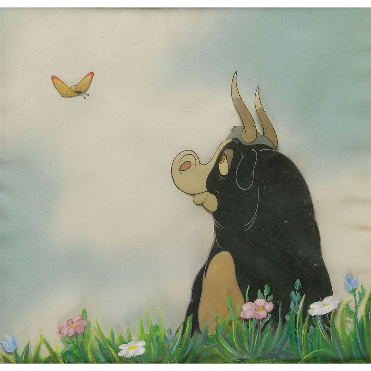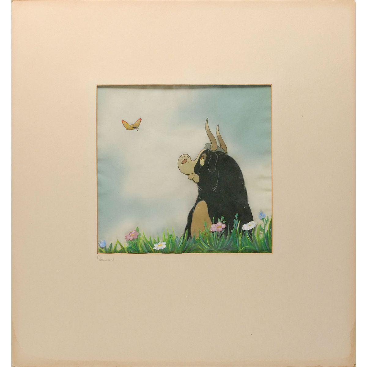 (Walt Disney Studios, 1938) Original production cel featuring Ferdinand with a butterfly from Ferdinand the Bull, showing the bull sitting in a field and watching the butterfly pass by. The cel has been trimmed and applied to an airbrushed background as prepared by the Disney Studio to be sold at the Courvoisier Galleries. Image measures 7.5 x 5.75, with a mat opening of 7.5 x 7.25. Mat dimensions are 15 x 16. The piece has the original Disney Courvoisier Galleries label on the reverse. A bit of rippling to celluloid and dampstaining to bottom edge of mat, otherwise fine condition.