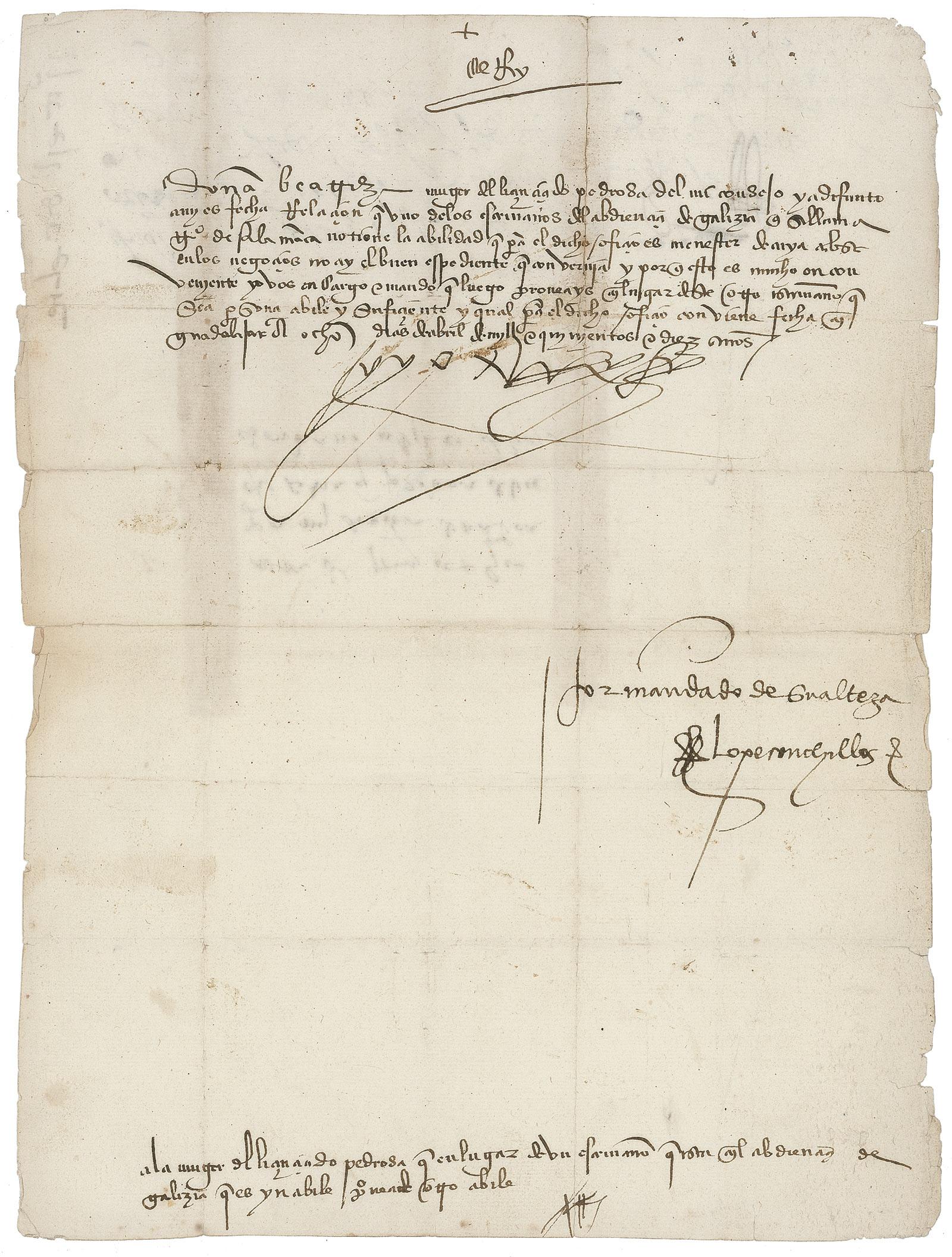 Manuscript DS signed by, one page, 8.25 x 11, dated April 8, 1510, in old Spanish. An order to Dona Beatriz Maldonado, wife of el Licenciado Pedrosa to appoint a replacement for Diego de Salamanca who was to be released as not being qualified for his post, boldly signed "Yo El Rey" at top-center. Salamanca would go on to redeem himself in the eyes of the King: he sailed to the Indies in 1512 and Cuba by 1519, and eventually helped aid in the capture of Tenochitlan, for which he would be awarded wide swaths of farmland by Cortez. In very good condition, with edge creasing and wrinkles, light show-through from reinforcement to vertical folds on reverse, a couple partial separations to folds, a couple folds through signature, and some mild toning. Pre-certified John Reznikoff/PSA/DNA and RRAuction COA.