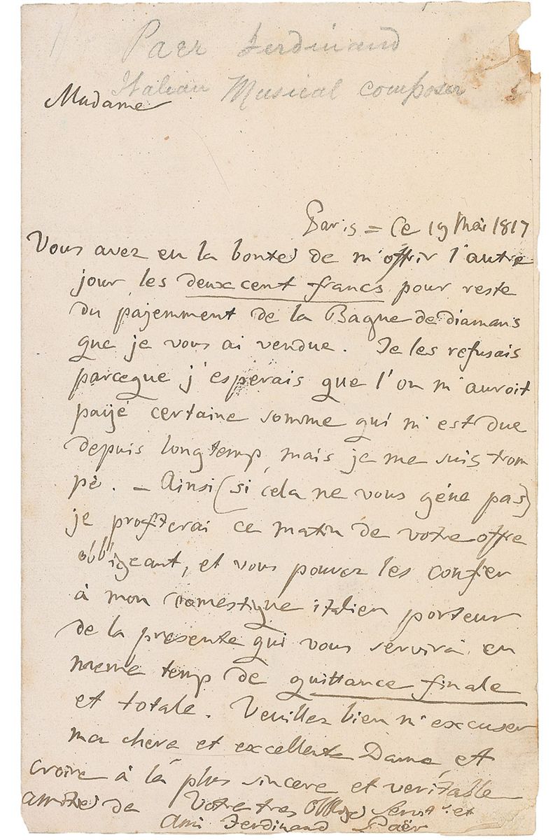 Italian-born composer and opera director (1771–1839) who was one of the first teachers of the young Franz Liszt. ALS in French, one page, 5 x 8.25, May 19, 1817. Untranslated letter to Madame Naderman in Paris. Reverse of second integral page bears an address in Paer’s hand. In very good condition, with paper loss to top right, intersecting folds, a diagonal crease to lower left, pencil notation to top edge, some light toning, and signature a bit cramped.