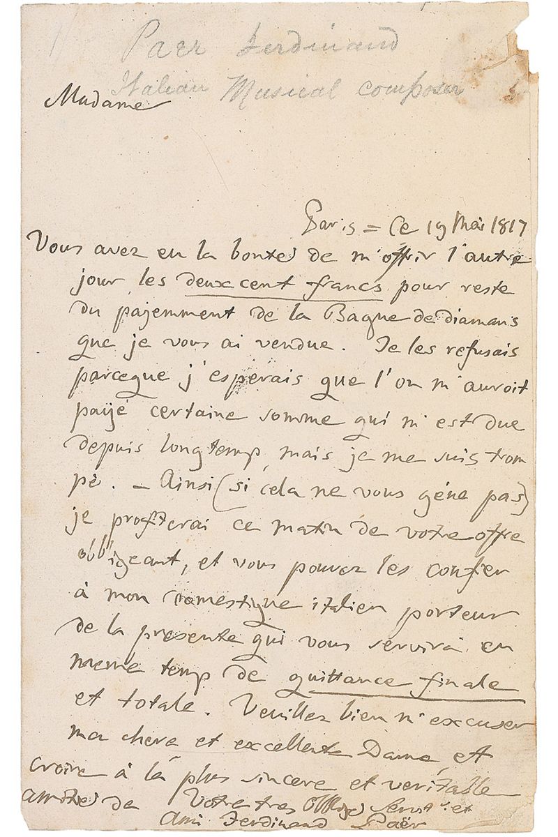 Italian-born composer and opera director (1771–1839) who was one of the first teachers of the young Franz Liszt. ALS in French, one page, 5 x 8.25, May 19, 1817. Untranslated letter to Madame Naderman in Paris. Reverse of second integral page bears an address in Paer’s hand. In very good condition, with paper loss to top right, intersecting folds, a diagonal crease to lower left, pencil notation to top edge, some light toning, and signature a bit cramped.