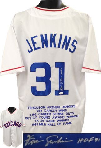 Fergie Jenkins was a three-time All-Star and the 1971 NL Cy Young Award winner. In 1991, Jenkins was inducted into the Baseball Hall of Fame. During a 19-year career, he pitched for four different teams, spending the majority of his career with the Chicago Cubs. Fergie Jenkins has hand signed this Chicago Cubs White TB Prostyle jersey with HOF 91 inscription and with Embroidered Stats. JSA Hologram and Certificate of Authenticity from Athlon Sports.