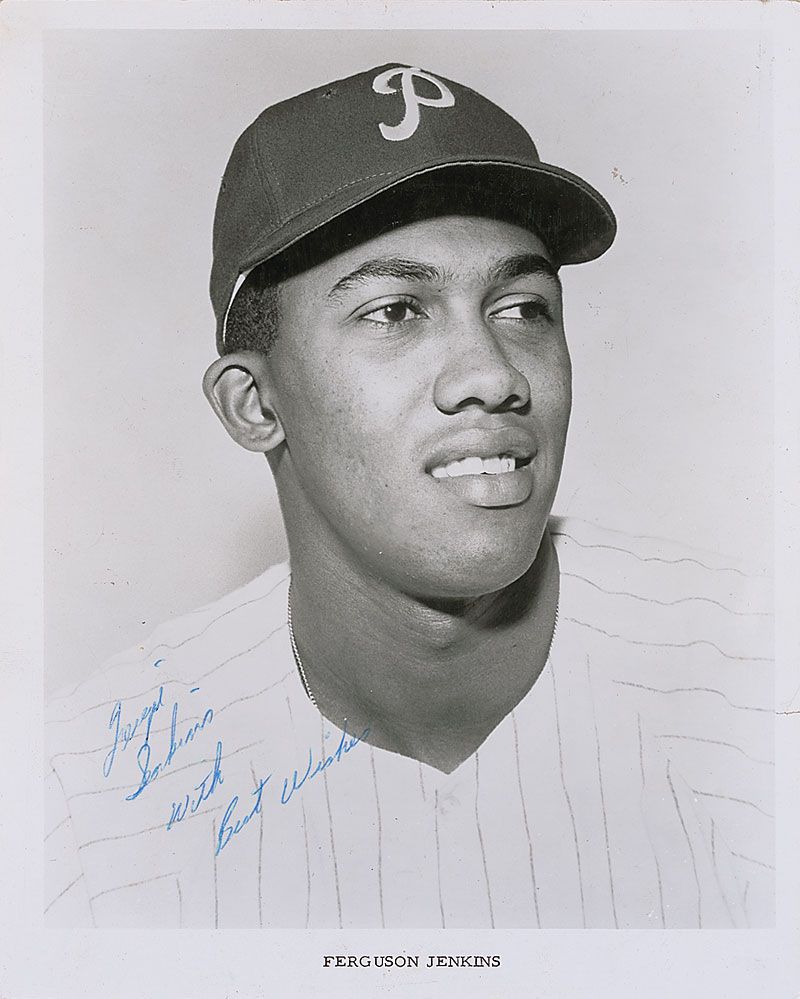Vintage glossy 8 x 10 head-and-shoulders photo of Jenkins in his Phillies uniform, signed in blue ballpoint, “Fergie Jenkins with Best Wishes.” A few scattered light creases and surface marks and a small tear to right edge, otherwise fine condition. This team-issued photo dates to Jenkins's rookie season and is extremely scarce in this format, as he was called up by the Phillies late in the 1965 season and was traded to Chicago the following year.