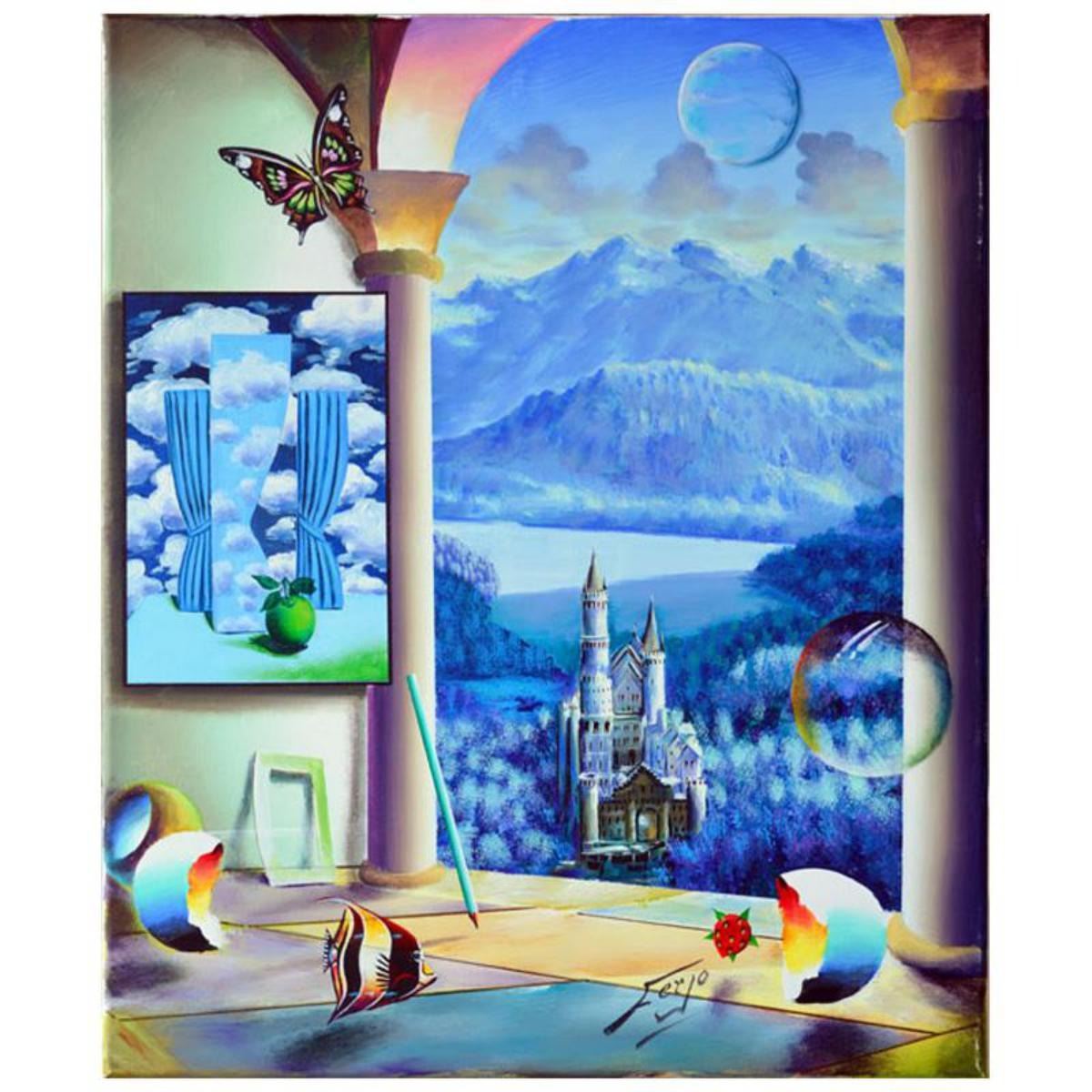 "Castle Before the Mountains" is an original painting, oil on stretched canvas, by Ferjo. Hand signed by the artist, this piece comes with a letter of authenticity. Measures approx. 24" x 20" (image). Reference #: 242398