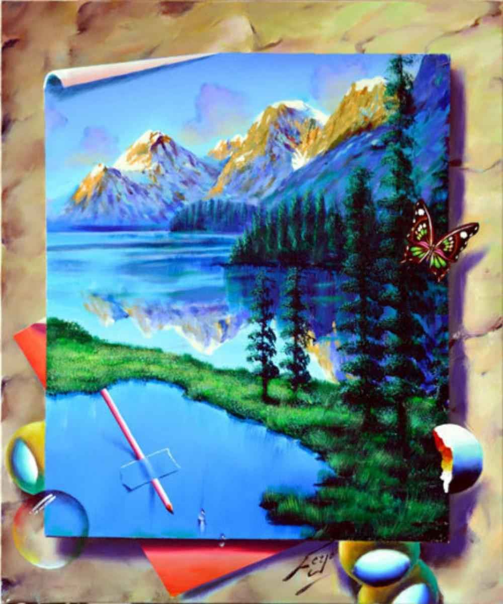Ferjo "Mountain Reflection" Hand Signed Original Oil on Stretched Canvas Dimensions: 24 x 20 Inches