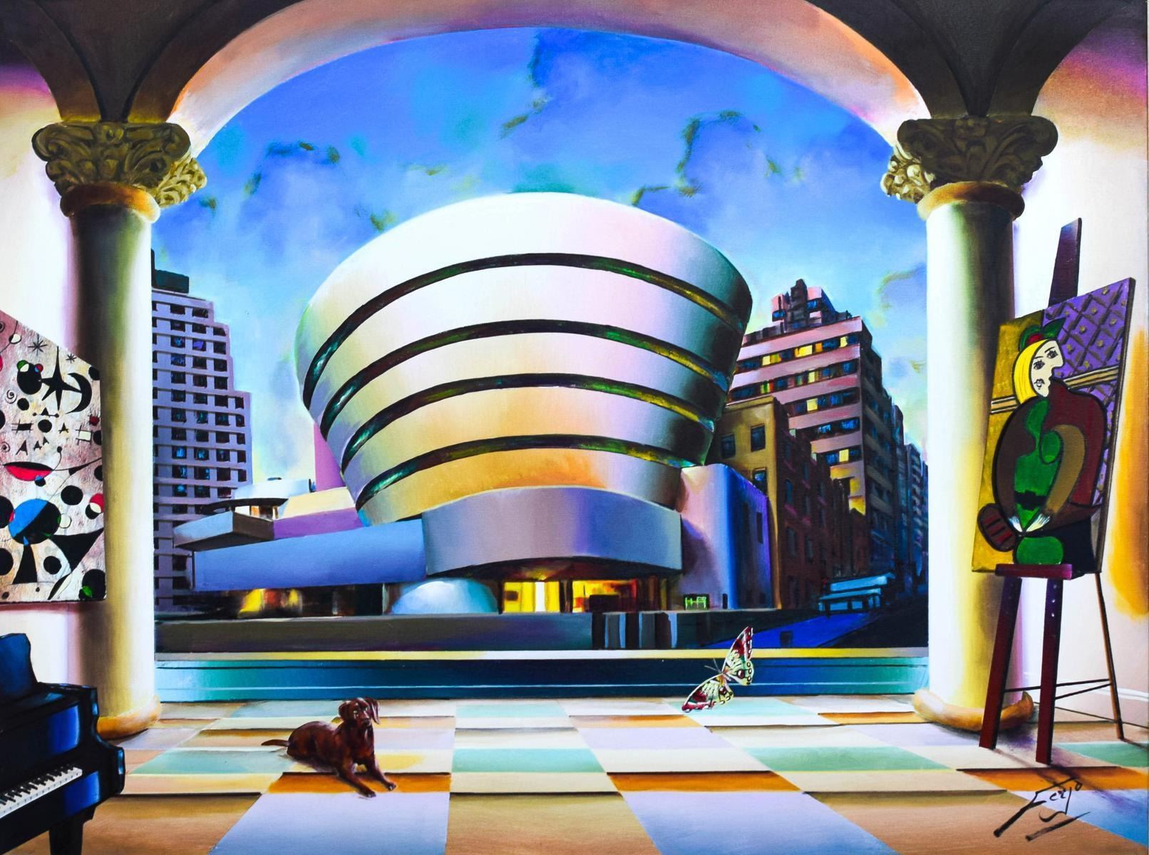 Artist: Ferjo. Medium: Original Oil on Canvas. Title: Guggenheim Ny. Size (Unframed): 30" x 40". Size (Framed): 38" x 48". Certificate of Authenticity: Is included. Additional: Custom framed. Reference# 14608.